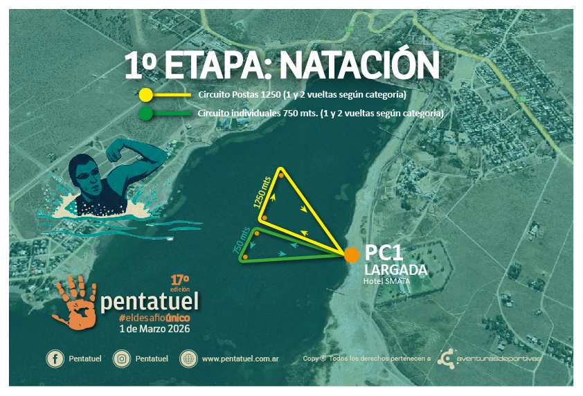 Los competidores deberán recorrer el trazado delimitado por las boyas, iniciándose la competencia en LA COSTA DEL LAGO FRENTE AL HOTEL SMATA. En las 2 categorías tanto Individual como Posta, los competidores deberán salir del agua y retornar a la misma para su control. La salida de los individuales estará en el mismo lugar de largada y la salida obligatoria de las postas será en el mismo lugar.
